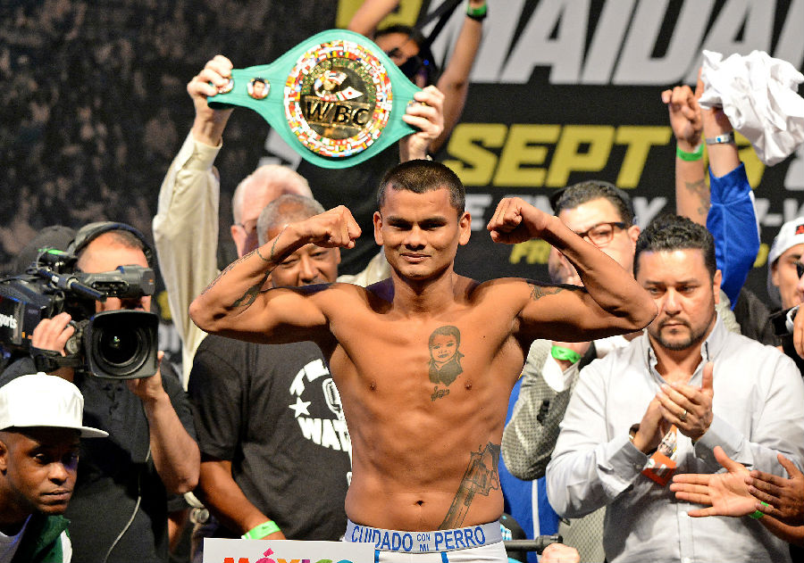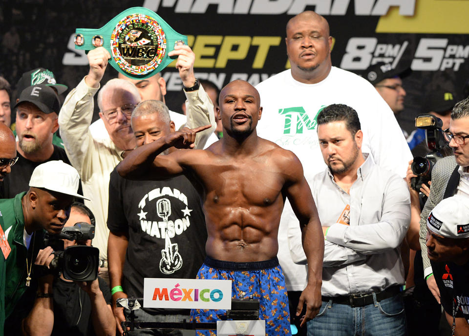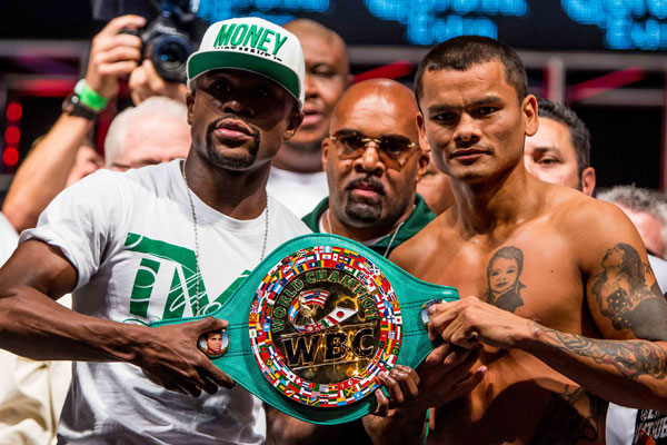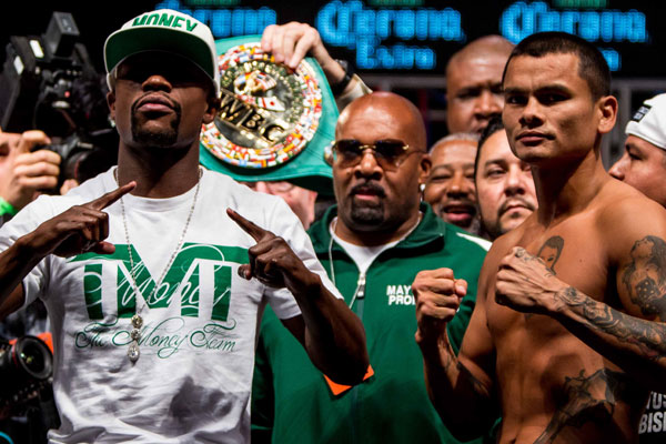 目前世界身价最高的拳王“金钱”弗洛伊德·梅威瑟(Floyd Mayweather)与前WBA次中量级冠军马科斯·麦达纳(Marcos Maidana)的二番战,将于今年9MMA月13日在美国拉斯维加斯举行。两人赛前称格斗重图片如下: