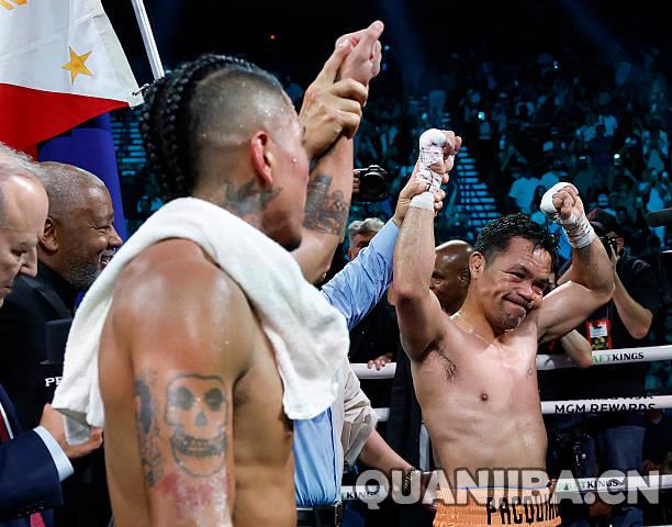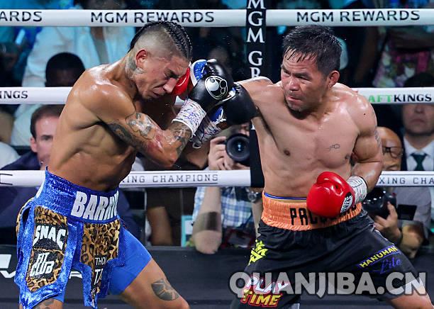帕奎奥(62-8-3, 39 KO)最后一场职业拳击比赛是在2021年8月点数负于尤德尼斯·乌加斯(Yordenis Ugas),将近四年没有正式比赛,并且年龄差距巨大,赛前帕奎奥并不被看好,不过今天帕奎奥的表现还是让所有人敬佩不已。相对而言巴里奥斯(29-2-2, 18 KO)的表现则有些保守,帕奎奥的体能和速度似乎没有下降,并且多次打出快速组合拳进攻。巴里奥斯虽然没有被重击,但是他的进攻也没有对帕奎奥造成太大UFC伤害。最终双方打满十二回拳击合,裁判给出(114-114、113-115、114-114)的点数双方战平,一位裁判把115的比分给了巴里奥斯,巴里奥斯平局卫冕金腰带。