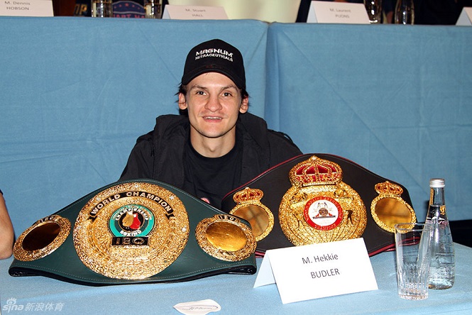 卫冕拳王、南非人巴德勒戴着一顶棒球帽,由于减重脱水的影响,他的眼窝有点内陷,眼睛四周黑了一圈,显然减体重减得相当辛苦。被主持人介绍点名后,巴德勒说:“熊朝忠是一位真正的冠军级拳手,他拿到过WBC的世界冠军,那也是我渴望得到的。我们俩的比赛是人们渴望看到的那种冠军级的赛事,我曾经想得到WBC的冠军,而熊拿到过这一桂冠,我认为我们之间的比赛将会是非常精彩的,我很期待和熊朝忠的较量。”