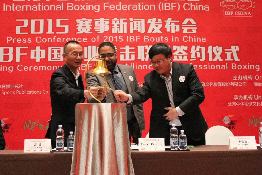 讯2015年3月10日,IBF(国际拳击联合会)中国区委员会在北京举行了2015年赛事新闻发布会暨IBF中国职业拳击联盟签约仪式。IBF中国今年的赛事计划得到了中国互联网新闻中心(中国网)及中国体育报业总社的大力支持,此次出席发布会的有国际拳击联合会(IBF)全球主席皮波斯(DarylJ.Peoples)先生、国际拳击联合会(IBF)冠军委员会主席林德赛·爱德华·塔克(LindseyEdwardTuckerJR)、国际拳击联合会(IBF)排名委员会主席阿尼巴尔·米拉蒙特斯(AnibalMiramontes)、IBF中国区主席姜强先生和执行主席王锐航先生。同时,国内50余家专业拳击俱乐部及其拳手、知名品牌企业、产业基金及专业媒体的百位嘉宾到场。