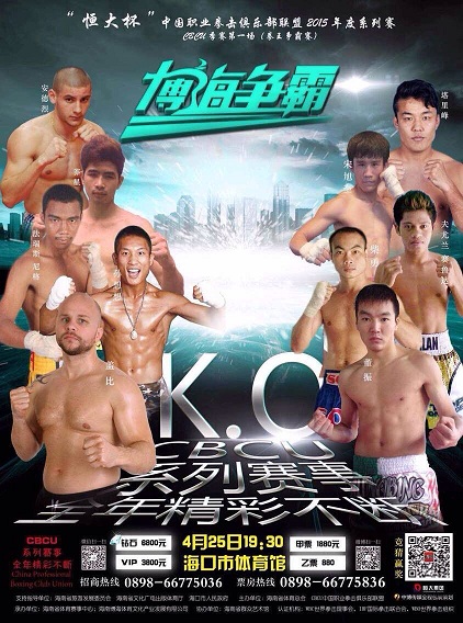 “恒大杯”中国职业拳击俱乐部联赛,将于4月25日在海口市体育馆举行。当天共有五场拳击比赛,三场职业拳击规则和两场自由搏击规则,并且有一场十二回合的WBO次最轻量级洲际金腰带之战。