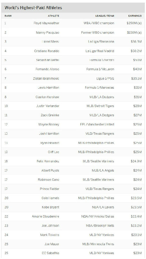 排名第三位的是带领巴萨夺得西甲冠军的足球巨星梅西,收入是5630万美元。第四位格斗是皇马球星C罗,收入5020万美元。两个人加起来也比不过帕奎奥,梅威瑟的收入是C罗的五倍。F1四冠王维特尔以5000万美元排名第五,另一个F1车王阿隆索以4000万美元排在第六位。第七位是瑞典球星伊布拉西莫维奇3500万美元。还是F1的汉密尔顿3100万美元位居第八。职棒大联盟MLB的球星克莱顿·克肖和贾斯汀,分别以3100万美元和2800万美元排名第九以及第十。