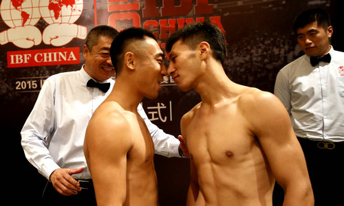 6月27日IBF中国职业拳击联赛北京赛区第三场排名赛开战在即,6月26日下午,参加此次拳赛的12位拳手悉数亮相北京香格里拉大酒店。在称重仪式现场,6对拳手怒目相持、气场强大、互不相让。
