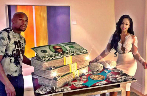 蛋糕的造型就是三叠美钞,美钞上面的头像还是他自己,这个蛋糕在灯光的照射下通体闪闪发亮,就好像布满了名贵珠宝一样。蛋糕加上水晶重达48公斤,不过当天参加派对的人却无缘品尝这个据说是柠檬和朗姆酒口味的蛋糕,因为梅威瑟郑重警告每个人:“没有人可以来切这个蛋糕!”