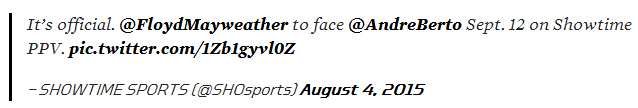 现任世界职业拳击P4P之王“金钱”弗洛伊德·梅威瑟(Floyd Mayweather)的下一场比赛终于敲定。先是之前梅威瑟通过个人推特透露消息,到今天Showtime Sports泰拳通过拳击官方推特宣布梅威瑟下一场比赛将对阵前WBC次中量级拳王安德雷·贝托(Andre Berto),时间是今年的9月12日(北京时间9月13日)地点在美国拉斯维加斯米高梅大酒店。