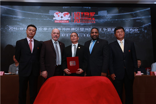 2015年7月16日15:30, IBF(国际拳击联合会)中国区委员会在苏州市举行了2015 IBF中国职业拳击联赛苏州赛区暨 IBF洲际拳王争霸赛新闻发布会。出席本次发布会的有IBF全球主席Daryl J. Peoples、IBF排名委员会主席Anibal Miramontes、IBF中国区主席姜强、IBF中国区执行主席王锐航、IBF中国联赛苏州赛区组委会主席刘定伟、中国职业拳击协会主席杨柏文、中国体育报专栏记者、中央电视台体育频道”拳王争霸“栏目主持人杜文杰和中央电视台体育频道主持人韩乔生。同时,参加苏州赛区排名赛首战的14名拳手、江苏省主要拳击俱乐部、国内知名品牌企业及近三十余家媒体共同出席了本次发布会。