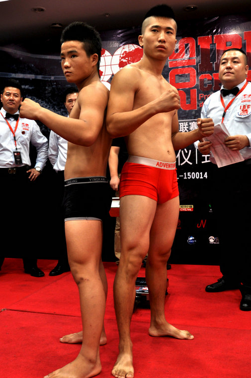 本次称重仪式火药味最浓的一对拳手是25岁的董昊和19岁的王申鹏,他们参加的是济南赛区排名赛第1场67公斤次中量级的比赛,还没等到在明天的比赛擂台上交锋,两人已在称重仪式上摩拳擦掌、跃跃欲试。来自田丹拳击俱乐部的董昊说:“对手比较年轻且身形比较瘦小,我担心他抗不住我的拳头,我估计能够在比赛中KO他!”而来自龙威搏击俱乐部的王申鹏则毫不客气地回敬道:“赛场上还是要以实力说话,说那么多话根本没用!对手可以尽管放马过来,我最不怕的就是高个臂长的拳手!我会让他在赛场上领略我的厉害!”