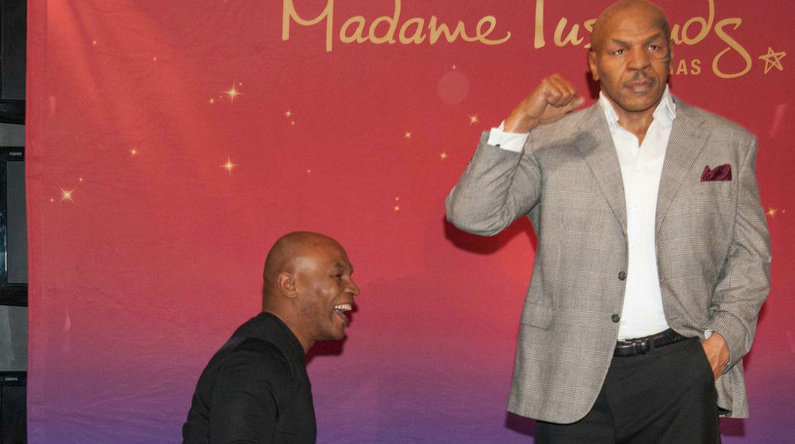 拳王泰森携家人出席活动 硬汉似向蜡像版自己下