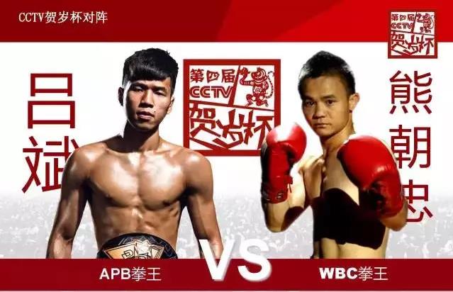 “猴年”春节大年初四、初五,中央电视台打造的拳击“贺岁UFC杯”将在四川泸州上演两天大戏,国内所有优秀拳手将登台亮相,展示中国拳击风采。其中,中国第一个职业拳击世界冠军熊朝忠对决国际拳联APB职业拳击世界冠军吕斌,开创了传统职业拳击与国际拳联体制内拳击同场竞技的先河,成为中国拳击历史乃至世界拳击历史的重要事件。