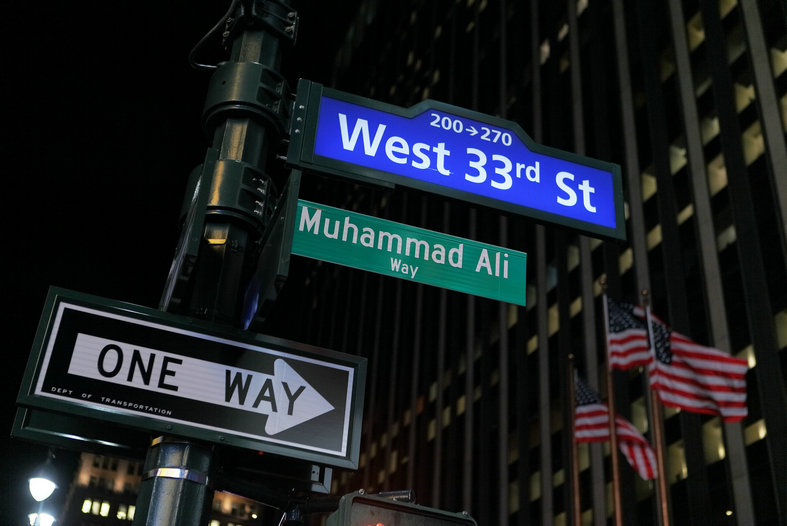麦迪逊广场花园8次见证了阿里的战斗,其中就包括1971年与乔-弗雷泽那场著名的世纪大战。那场比赛,让阿里吞下了职业生涯首败,不过三年后,在同一场地,阿里通过二番战复仇成功,让世人见证了他的伟大。能够让纽约城通过更改路名的方式向自己的致敬,阿里凭借的绝不仅仅是拳台上的成绩,他的人格魅力,以及他为人类和平和反种族歧视做出的不屑努力和斗争在全世界为他赢得了赞誉。