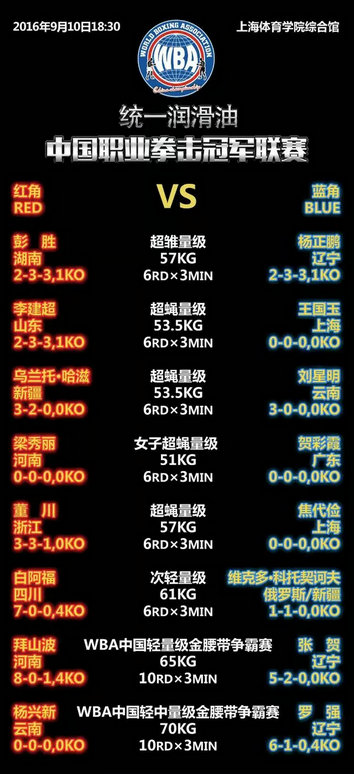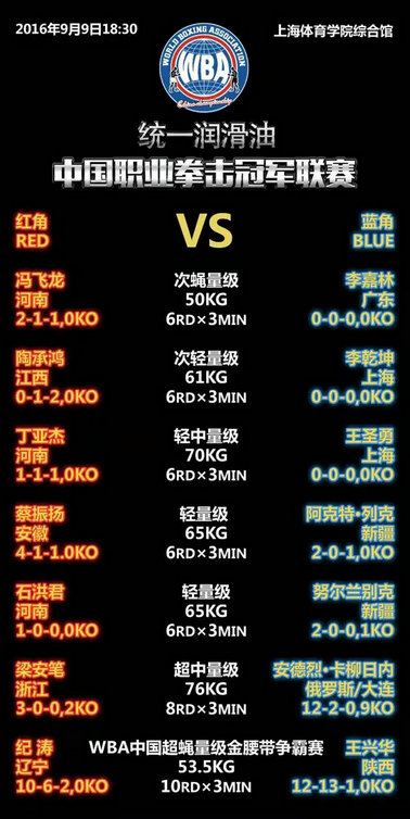 2016年9月9日到10日,WBA中国职业拳击冠军联赛将在上海体育学院综合馆展开较量,届时,十五场精彩纷呈的拳赛将在这两天中上演,而这其中最引人注目的对决,便是两场金腰带冠军赛。