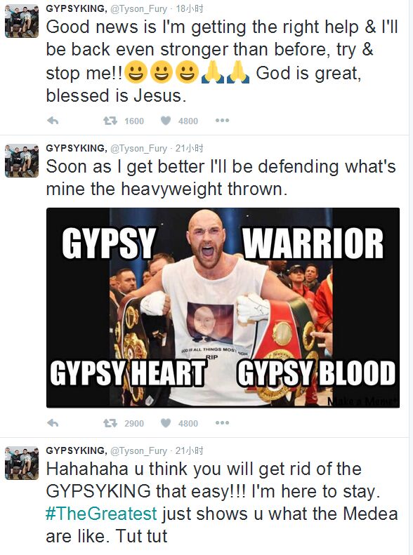 第二天他又发了几条微博表示:“我感觉好多了,我会捍卫我的重量级冠军头衔。好消息,我得到了正确的帮助,我会回来的,比以前更强大,可以尝试阻止我!感谢上帝。”