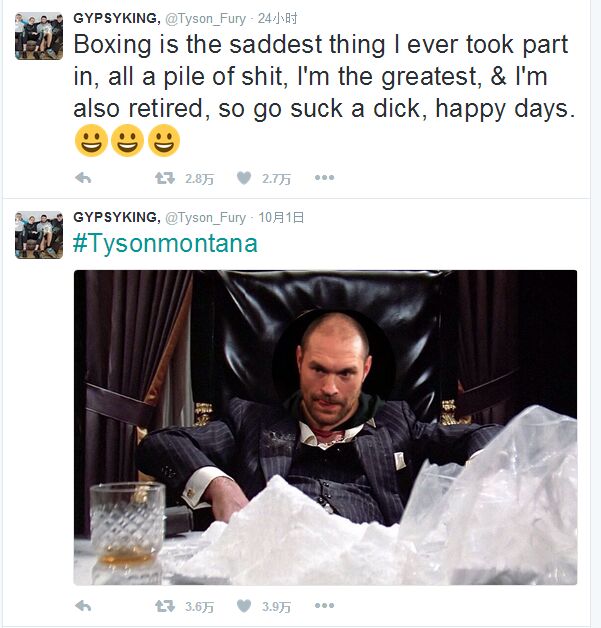 泰森·富里在自己的推特Twitter上发文:“拳击是我一生经历中最悲伤的,都是一堆屎。我是最伟大的,我要退役,去他喵的,开心的一天。”