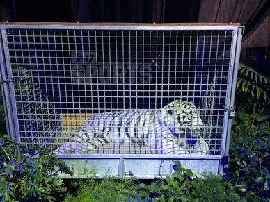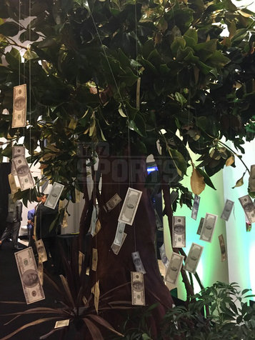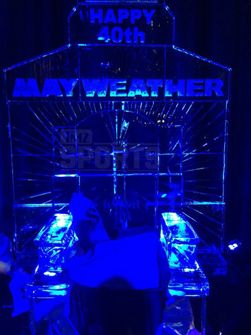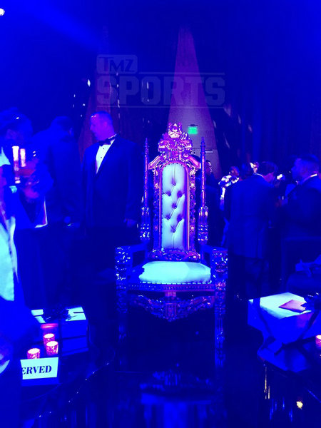 一进生日派对的门口,就是一个摇钱树,树上挂满了印着梅威瑟头像的美元,旁边笼子里放着的是梅威瑟的宠物,一只白色孟加拉虎乖乖的在里面迎接宾客的到来。梅威UFC瑟的生日蛋糕也是超级大,在一个装满美金的箱子上,是金腰带和拳套还有TMT标志和王冠的蛋糕。