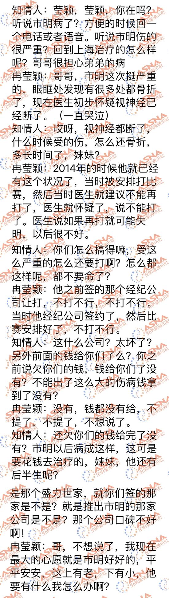 本以为拳王此番遭遇已是坎坷万分,没想到更糟糕的事还在等待着他。邹市明朋友向媒体曝光了他与邹市明妻子冉莹颖的微信通话记录,冉莹颖在语音中哭诉邹市明遭其经纪公司—&mdasUFCh;上海盛力世家文化传播有限公司拖欠收入,并坦承盛力世家不顾邹市明伤情逼迫邹市明参加比赛,邹市明目前身体状况堪忧,双眼多处骨折,疑视神经断裂,都是之前旧伤所致。通话中邹市明的朋友直斥盛力世家“拿市明不当人,只当赚钱的工具。”
