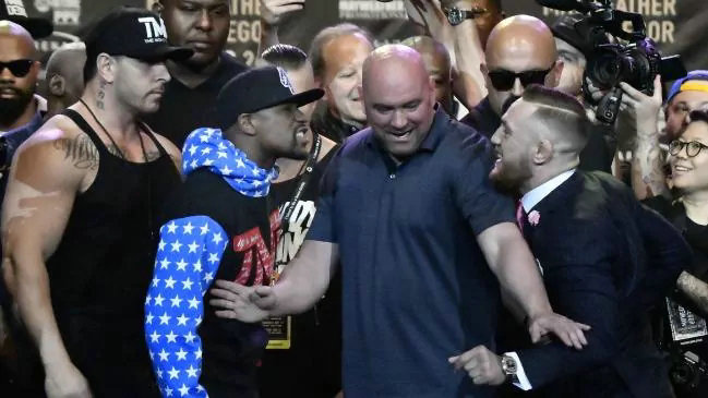 保镖罗萨(左1)在梅威瑟与麦格雷戈发布会现场
