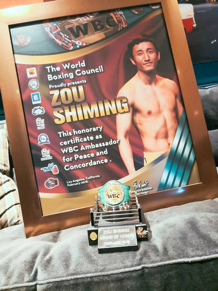 当地时间2月24日在美国洛杉矶,中国拳击运动员邹市明获得WBC(世界拳击理事会)授予的“最高荣誉奖”以及“WBC和平与和谐大使”称号,以表彰他在拳击运动领域取得的卓越成就。