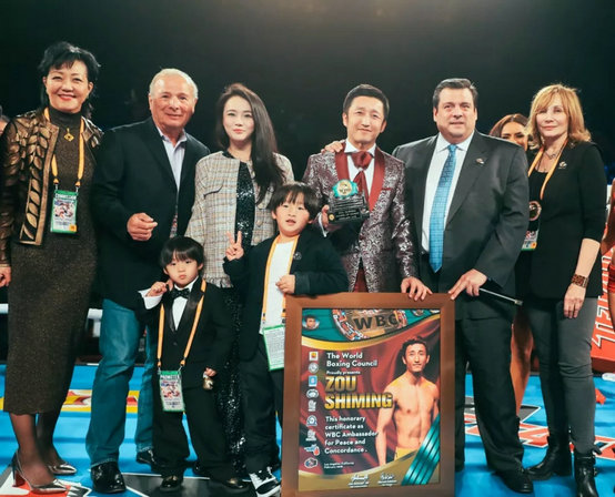WBC主席小苏莱曼(Mauricio Jose Sulayman)亲自为邹市明颁发奖杯和证书,邹市明与妻子冉莹颖还有两个儿子轩轩和皓皓全家一起接受了这份WBC的最高荣誉。