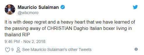 WBC主席马鲁西奥-苏莱曼也在推特悼念这位意大利选手