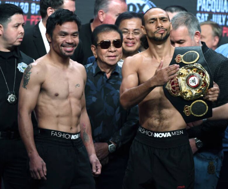 曼尼·帕奎奥(61-7-2,39 KO)已经40岁高龄,身高168cm臂展170cm。1995年开始职业生涯,夺得过八个级别世界冠军头衔。自从2015年点数负于弗洛伊德·梅威瑟(Floyd Mayweather Jr.)后,2016年分别战胜蒂莫西·布拉德利(Timothy Bradley Jr)和杰西·瓦尔加斯(Jessie Vargas)夺回WBO次中量级世界冠军头衔泰拳。但是在2017年7月点数负于杰夫·霍恩(Jeff Horn),不过在2018年7月第七回合TKO卢卡斯·马特西(Lucas Matthysse)夺得WBA次中量级冠军金腰带,刚刚在今年1月点数战胜阿德里安·布罗纳(Adrien Broner)成功卫冕了WBA世界冠军头衔。