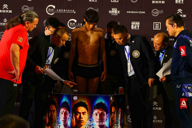 称重是从15时开始的,按照比赛的6对选手出场频率,两两出场进行称重,然后对视。