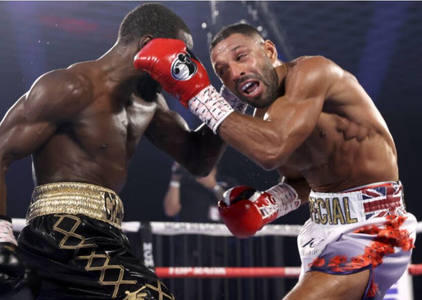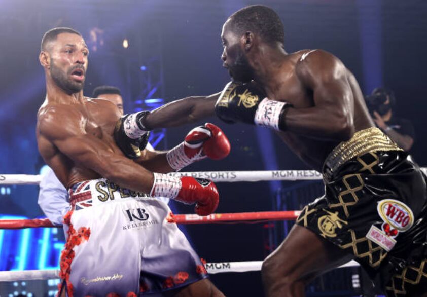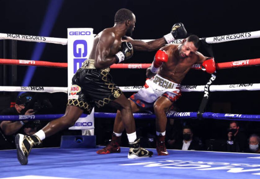 第一局双方都非常谨慎,特伦斯·克劳福德(37-0,28 KO)基本都在前手拳试探,凯尔·布鲁克(39-3,27 KO)也没有敢冒然强攻。第二局开始双方依旧很谨慎,不过之后布鲁克开始主动出击泰拳,克劳福德也换成左架应对反击。第三局克劳福德开始加强攻势,在几次对攻中克劳福德略占上风。第四局克劳福德步步紧逼,随后抓住时机重拳打的布鲁克摇格斗晃,裁拳击判给布鲁克读秒一次,之后克劳福德连续组合拳猛攻,布鲁克毫无招架之力,裁判终止比赛,最终克劳福德第四回合1分14秒TKO获胜。