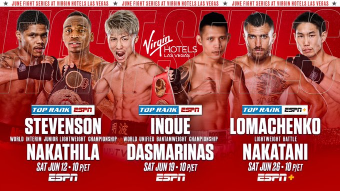 今天TOPRANK顶级拳击推广公司公布了6月份备受关注的三场比赛对决,WBO羽量级冠军沙库尔·史蒂文森(Shakur Stevenson)6月12日对阵纳米比亚选手杰里迈亚·纳卡西拉(Jeremiah Nakathila);WBA与IBF雏量级世界冠军井上尚弥(Naoya Inoue)6月19日对阵菲律宾选手迈克尔·达斯马里纳斯(Michael Dasmarinas);前WBA、WBO和IBF轻量级冠军瓦西里·洛马琴科(Vasiliy Lomachenko)6月26日对阵日本选手中谷正义(Masayoshi Nakatani)。