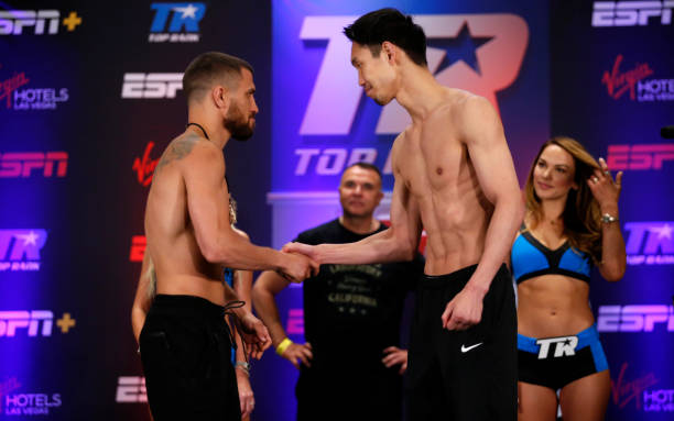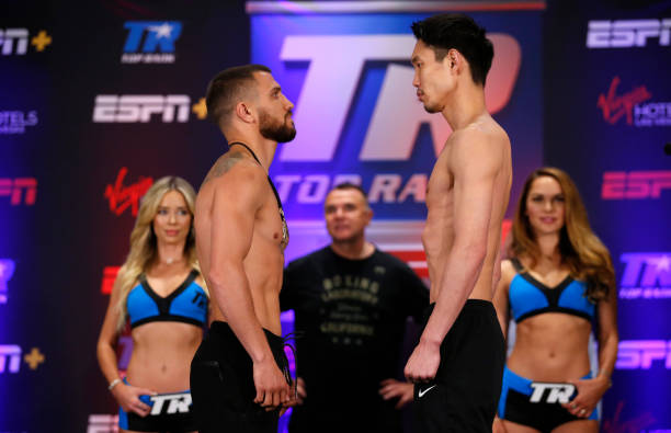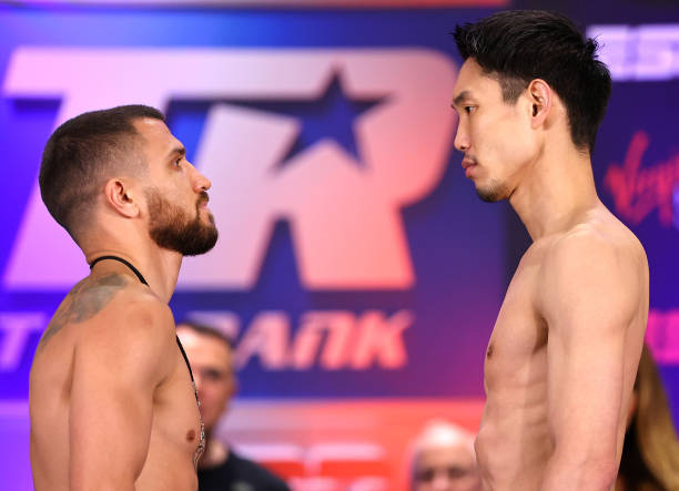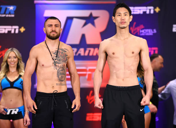 散打 前WBA、WBO和IBF轻量级冠军瓦西里·洛马琴科(Vasiliy Lomachenko)与日本选手中谷正义(Masayoshi Nakatani)即将于北京时间6月27日在美国拉斯维加斯进行十二回合比赛,今天双方进行了赛前称重,洛马琴科体重134.6磅,中谷正义体重134.4磅。