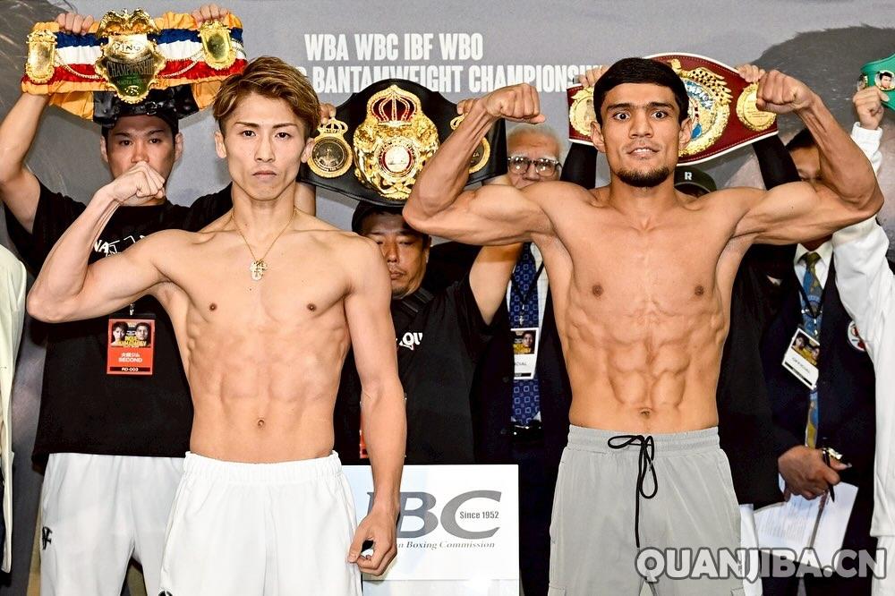 今天的赛前称重仪式上,井上尚弥(30-0, 27 KO)体重为55.2kg,穆罗琼·阿赫玛达利耶夫(14-1, 11 KO)体重为55.0kg。