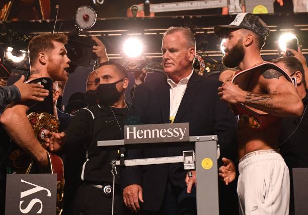 索尔·阿瓦雷兹(56-1-2,38 KO)今年31岁,身高175cm臂展179cm。2005年开始职业拳击生涯,自从2013年点数输给弗洛伊德·梅威瑟(Floyd Mayweather Jr.)后,至今已经取得14胜1平的成绩。其中2019年11月第十一回合KO谢尔盖·拳击;泰拳科瓦列夫(Sergey Kovalev)夺得WBO轻重量级冠军金腰带。2020年12月点数战胜卡勒姆·史密斯(Callum Smith)夺得WBA和WBC超中量级冠军头衔,今年2月第三局TKO夫尼·耶尔迪里姆(AvniYildirim)成功卫冕冠军头衔,刚刚在5月第八回合TKO比利·乔·桑德斯(Billy Joe Saunders)成为WBA、WBC和WBO三个组织的超中量级世界冠军。