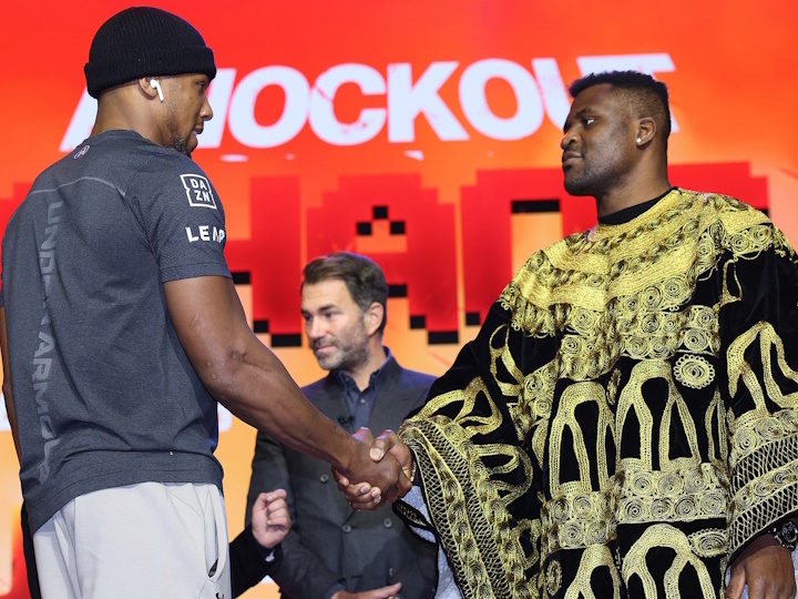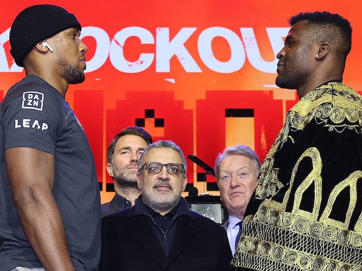 今天,前世界重量级拳王英国人安东尼-约书亚(27-3,24KO)和前UFC重量级冠军弗朗西斯-纳干诺(17-3,12K,4S)召开了赛前首次新闻发布会。3月8日,两人将在沙特利雅得王国体育场进行一场预定为10个回合的重量级比赛。目前赔率是1-4,约书亚被看好。在之前的副主赛中,我国的张志磊(26-1-1,21KO)将对阵前WBO重量级拳格斗王约瑟拳击夫-帕克(34-3,23KO)。
