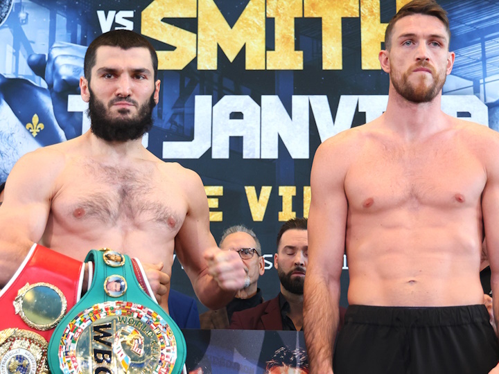 今天,现WBC泰拳/IBF/WBO轻重量级拳王俄罗斯裔加拿大人阿图尔-贝特比埃夫(19-0,19KO)和前WBA超中量级超级拳王英国人卡勒姆-史密斯(29-1,21KO)在加拿大魁北克举行了赛前称重仪式。北京时间1月14日中午,两人将进行一场预定为12个回合的轻重量级拳王争霸战,贝特比埃夫卫冕175磅的三条金腰带。