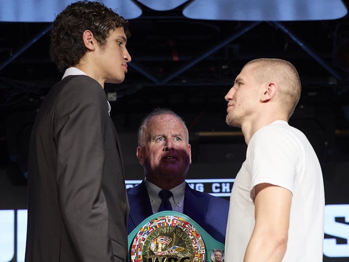 今天,前WB拳击C超次中量级过渡拳王美国“电线杆”塞巴蒂斯安-方多拉(20-1-1,13KO)和乌克兰新秀塞瑞尔-博哈楚克(23-1,23KO)在洛杉矶召开了首次新闻发布会,宣布了3月30日的比赛,两人将争夺空缺的WBC超次中量级拳王金腰带,这也是蒂姆-茨尤Vs凯斯-瑟曼主赛前的一场重要垫赛。目前赔率是1-2,方多拉略被看好。博哈楚克身高1米83,在154磅已经是大个拳手了,但方多拉身高1米97,泰拳橡根竹竿。