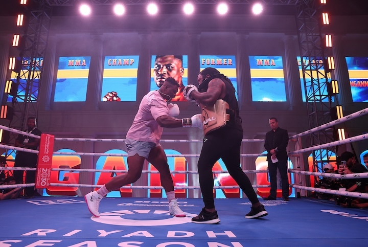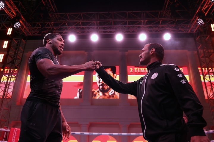 今天,前世界重量级拳王安东尼-约书亚(27-3,24KO)、现WBO重量级过渡拳王张志磊MMA(26-1-1,21KO)、前UFC重量级冠军弗朗西斯-纳干诺(17-3,12K,4S)、前WBO重量级拳王约瑟夫-帕克(34-3,23KO)在沙特利雅得举行了赛前公开训练。北京时格斗间3月9日(本周六)早晨,约书亚将大战纳干诺,张志磊对阵帕克,本站将提UFC供高清直播。