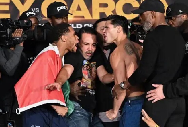 今天早些时候,前WBC超轻量级过渡拳王美国“闪电侠”瑞恩-加西亚(24-1,20KO)和现WBC超轻量级拳王/两个级别的世界冠军德文-哈尼(31-0,15KO)在纽约布鲁克林巴克莱中心进行了赛前称重仪式。北京时间4月21日中午,两人将进行一场预定为12个回合的超轻量级拳王争霸战,德文-哈尼第一次卫冕WBC-140磅的世界拳王。