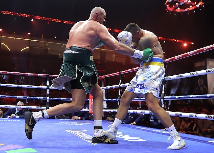 泰森-富里在昨天的比赛中3-7回合打的不错,一度控制了局面,不过第8回合开始乌西克占据了上风,第9回合那次击倒奠定了胜局。