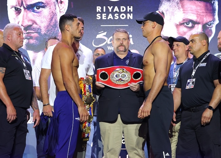 泰森-富里Vs乌西克主赛前的副主赛是由现《拳坛》杂志次重量级拳王澳大利亚人贾艾-欧佩泰亚(24-0,19KO)对阵老对手前两度次重量级拳王拉脱维亚人迈里斯-布雷迪斯(28-2,20KO),两人争夺空缺的IBF次重量级拳王金腰带。欧佩泰亚今天称重198.1磅,布雷迪斯199.1磅。两人曾在2022年7月打了一战,当时欧佩泰亚以116-112、116-112、115-113的点数取胜。
