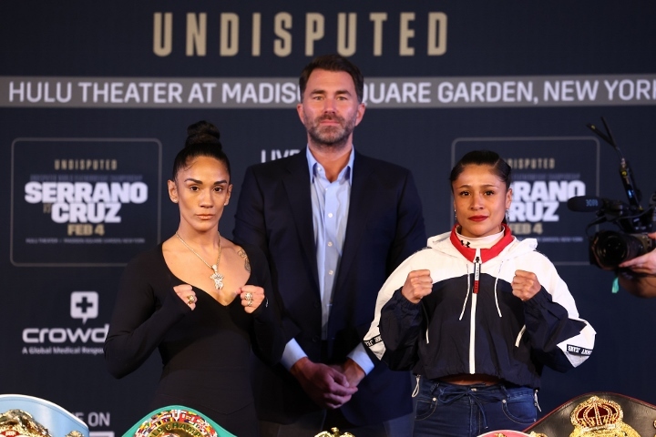 今天,七个级别的女子世界拳王“女版帕奎奥”波多黎各人阿曼达-塞拉诺(43-2-1,30KO)和现WBA羽量级女子拳王墨西哥人艾利卡-赫尔南德兹(15-1,3KO)在纽约麦迪逊花园广场召开了赛前最后一次新闻发布会。北京时间2月5日(周日)上午,两人将进行126磅的女子终极统一战。塞拉诺目前是WBC/IBF/WBO/IBO四料女子羽量级拳王,只缺一条WBA金腰带就统一126磅了。