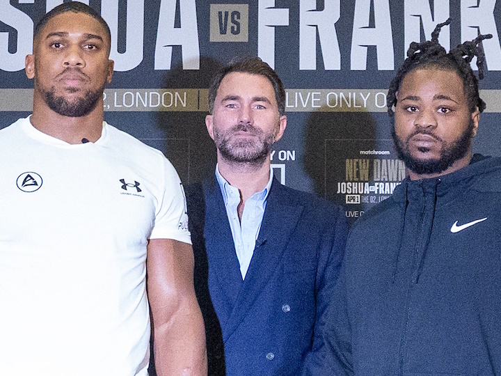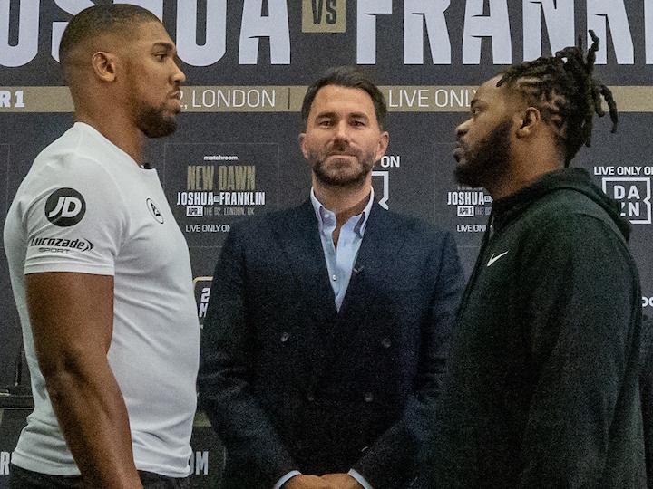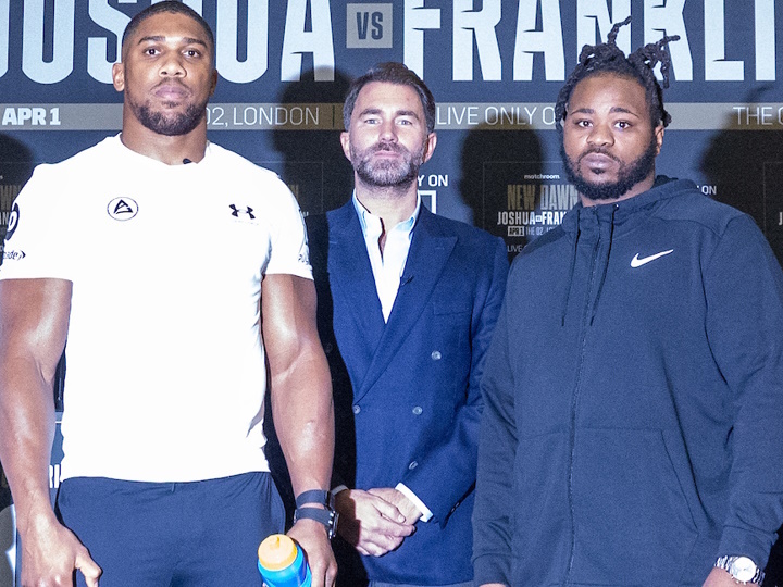 今天,前WBA超级/IBF/WBO/IBO重量级拳王英国人安东尼-约书亚(24-3,22KO)和美国“989杀手&rdquMMAo;杰梅因-弗兰克林(21-1,14KO)召开UFC了赛前首次新闻发布会。北京时间4月2日,两人将在英国伦敦O2体育场进行一场预定为12个回合的重量级比赛,这也是约书亚的复出战,此前他两次输给了乌西克(20-0,13KO)。弗兰克林拳击上一战点数输给了迪廉-怀特(29-3,19KO),不过争议很大。