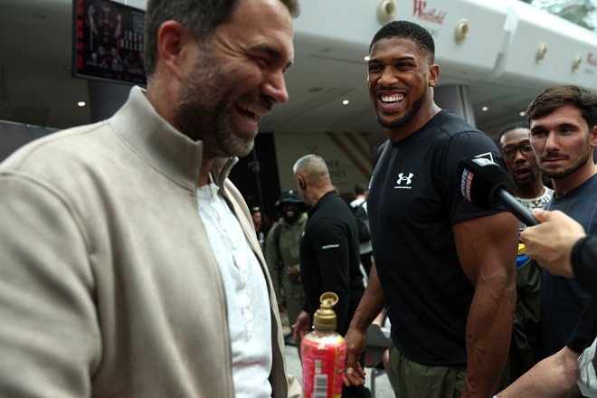 近日,前世界重量级拳王英国人安东尼-约书亚(26-3,23KO)的推广人埃迪-赫恩向媒体表示,自己是约书亚的头号粉丝,深信约书亚可以KO德昂泰-维尔德(43-2-1,42KO)、泰森-富里(33-0-1,24KO)。