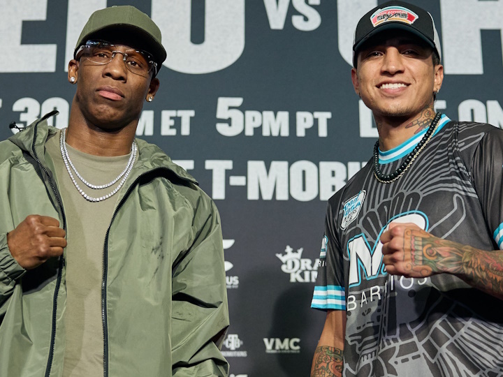 今天,美国超次中量级新秀小杰苏斯-拉莫斯(20-0,16KO)、埃里克森-鲁宾(25-2,18KO)、前WBA次中量级超级拳王古巴人尤丹尼斯-乌加斯(27-5,12KO)、前WBA超轻量级普通拳王美国人马里奥-巴里奥斯(27-2,18KO)抵达了拉斯维加斯米高梅大酒店,为本周UFC日的比赛做最后准备。乌加斯将和巴里奥斯争夺空缺的WBC-147磅过渡拳王,小拉莫斯将大战拉宾,这也是阿瓦雷兹的副主赛。
