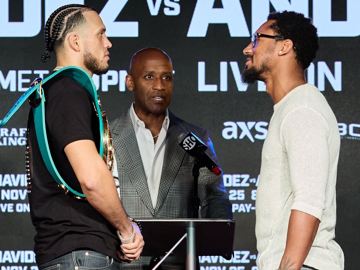 今天,现WBC超中量级过渡拳王美国“红旗&r格斗dquo;大卫-本纳维德兹(27-0,23KO)和前世界超次中量级/中量级拳王美国同胞德梅特里奥斯-安德拉德(32-0,19KO)在洛杉矶召开了赛前首次新拳击闻发布会。11月25日两人将进行一场预定为12个回合的超中量级比赛,大卫-本纳维德兹卫冕WBC-168磅的过渡拳王。目前赔率是1-4,大卫-本纳维德兹被看好。