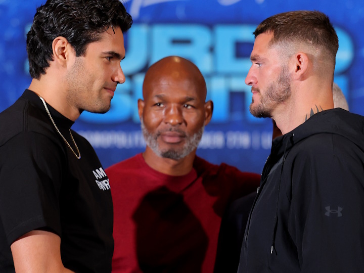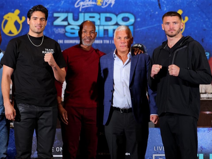 今天,前WBO超中量级拳王墨西哥人吉尔贝托-拉米雷兹(44-1,30KO)和前WBO轻重量级拳王美国人小乔-史密斯(28-4,22KO)在拉斯维加斯召开了赛前新闻发布会。北京时间10月8日(本周日),两人将进行一场预定为12个回合的WBA次重量级拳王资格淘汰赛,193磅上限。泰拳两人去年分别输给了比沃尔、贝特比UFC埃夫,现在去次重量级寻找新的机会。