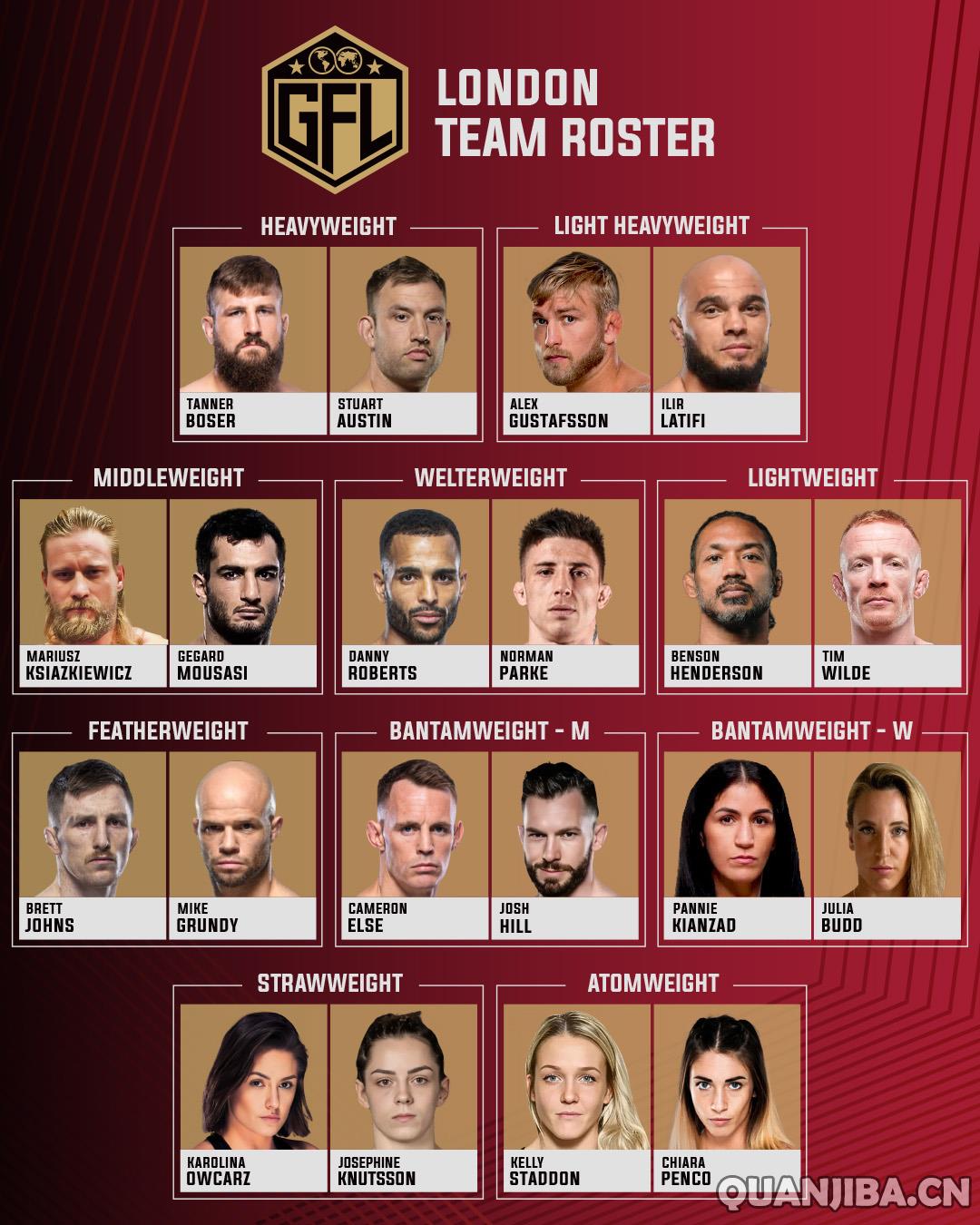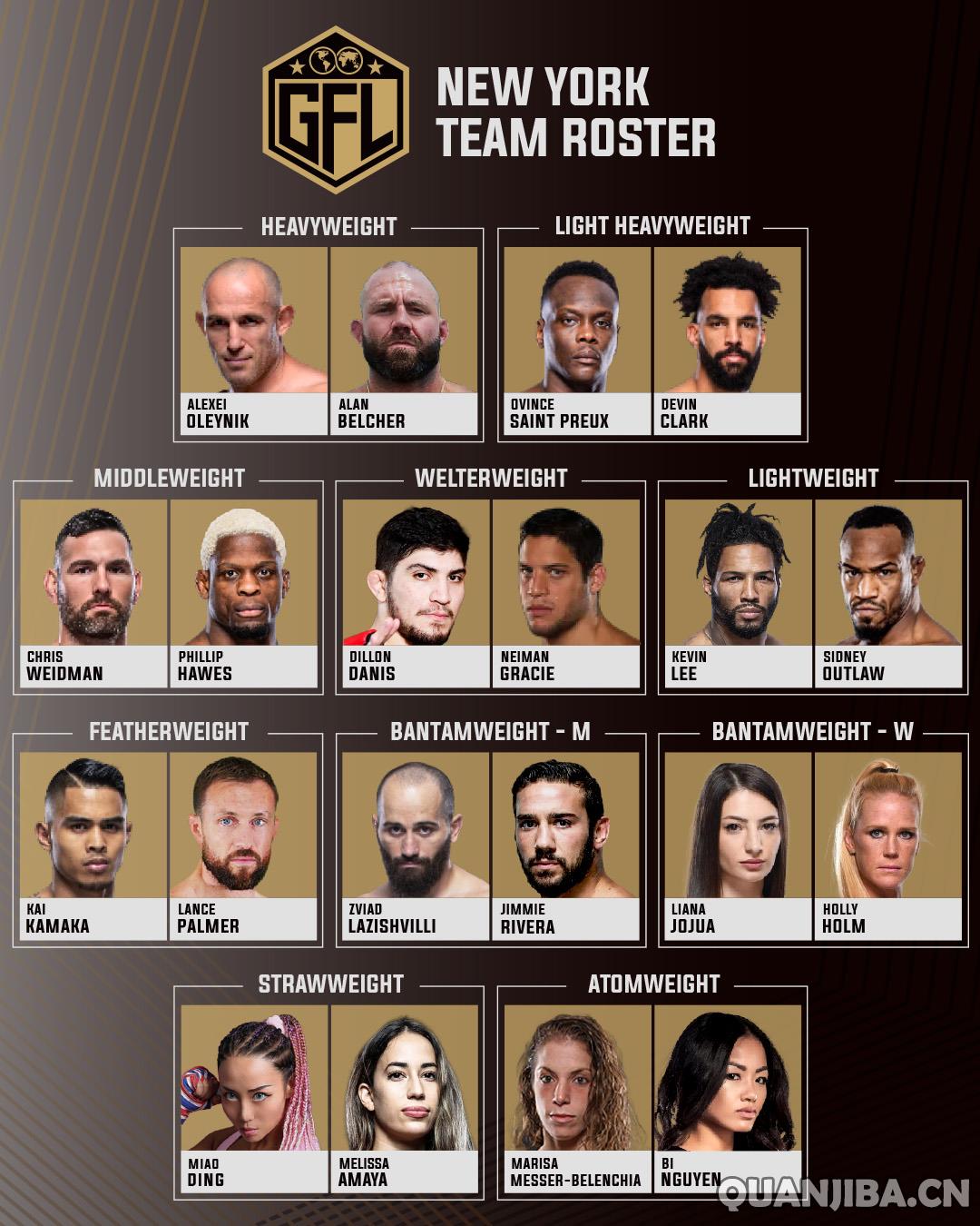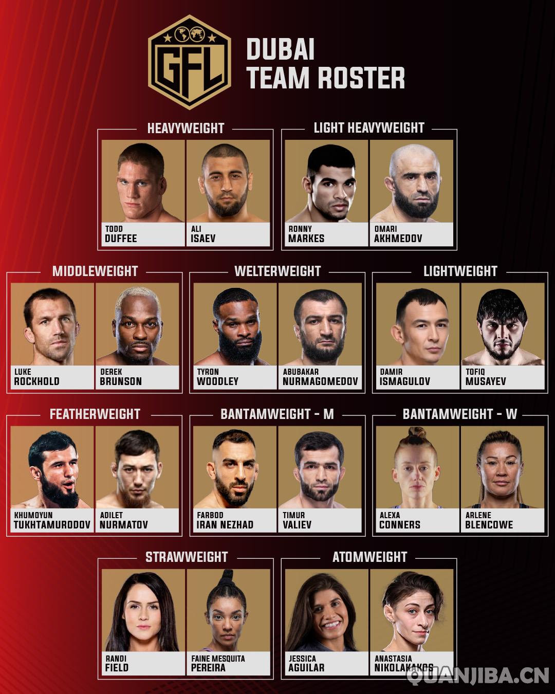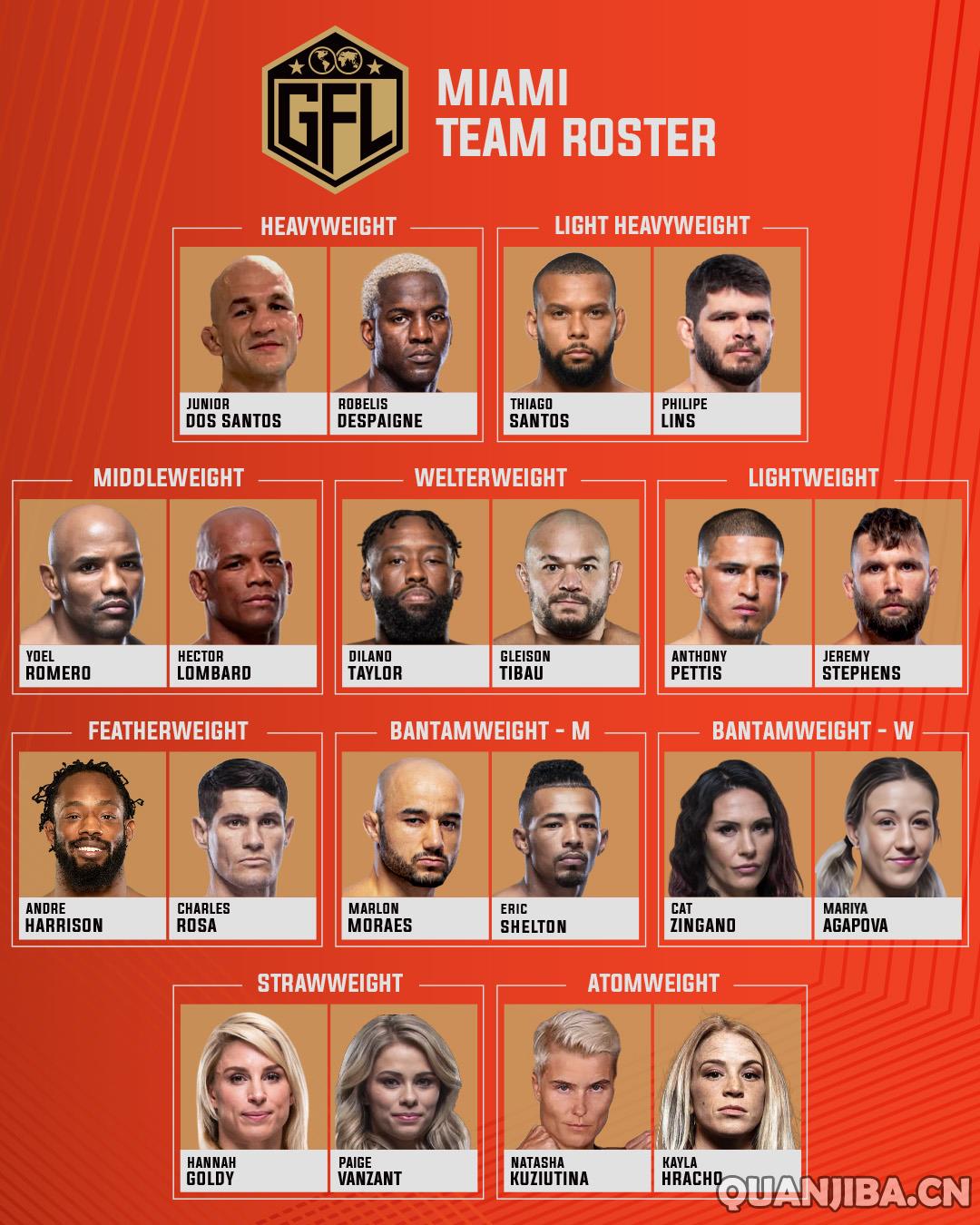 GFL将于今年4月开始比赛,推出以团队为基础的MMA联赛,并实行赛季制度。六大战队分别是:伦敦队、迪拜队、圣保罗队、迈阿密队、洛杉矶队、纽约队。中国选手丁苗(18-8,9 K,9 S)被选入纽约队。