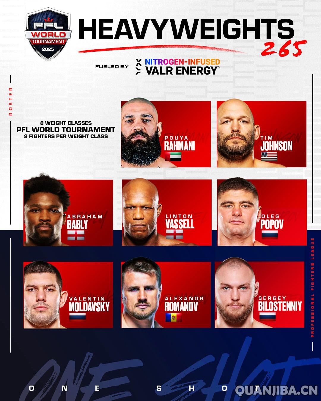 The eight heavyweights in the PFL tournament are: former Bellator interim heavyweight champion Valentin Moldavsky (13-4, 2 K, 3 S, 1 N), former UFC standout Alexander Romanov (18-3, 6 K, 9 S), Tim Johnson (18-11, 10 K, 3 S), Oleg Popov (19-2, 9 K, 3 S), Linton Vassell (24-10, 10 K, 8 S, 1 N), Sergey Bilostenniy (13-3, 8 K, 1 S), Pouya Rahmani (4-0, 1 K, 3 S), and Abraham Bably (5-1, 3 K, 0 S).