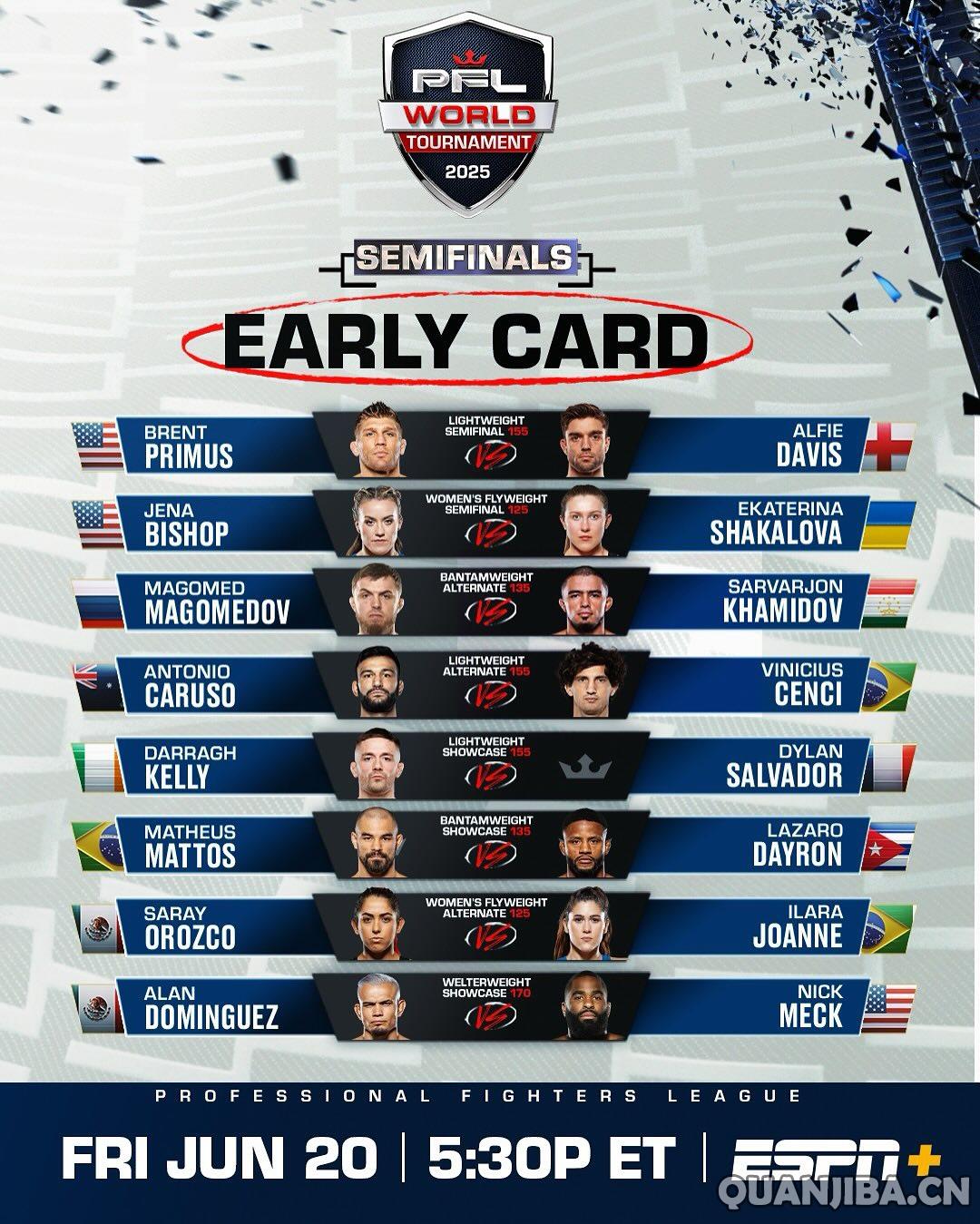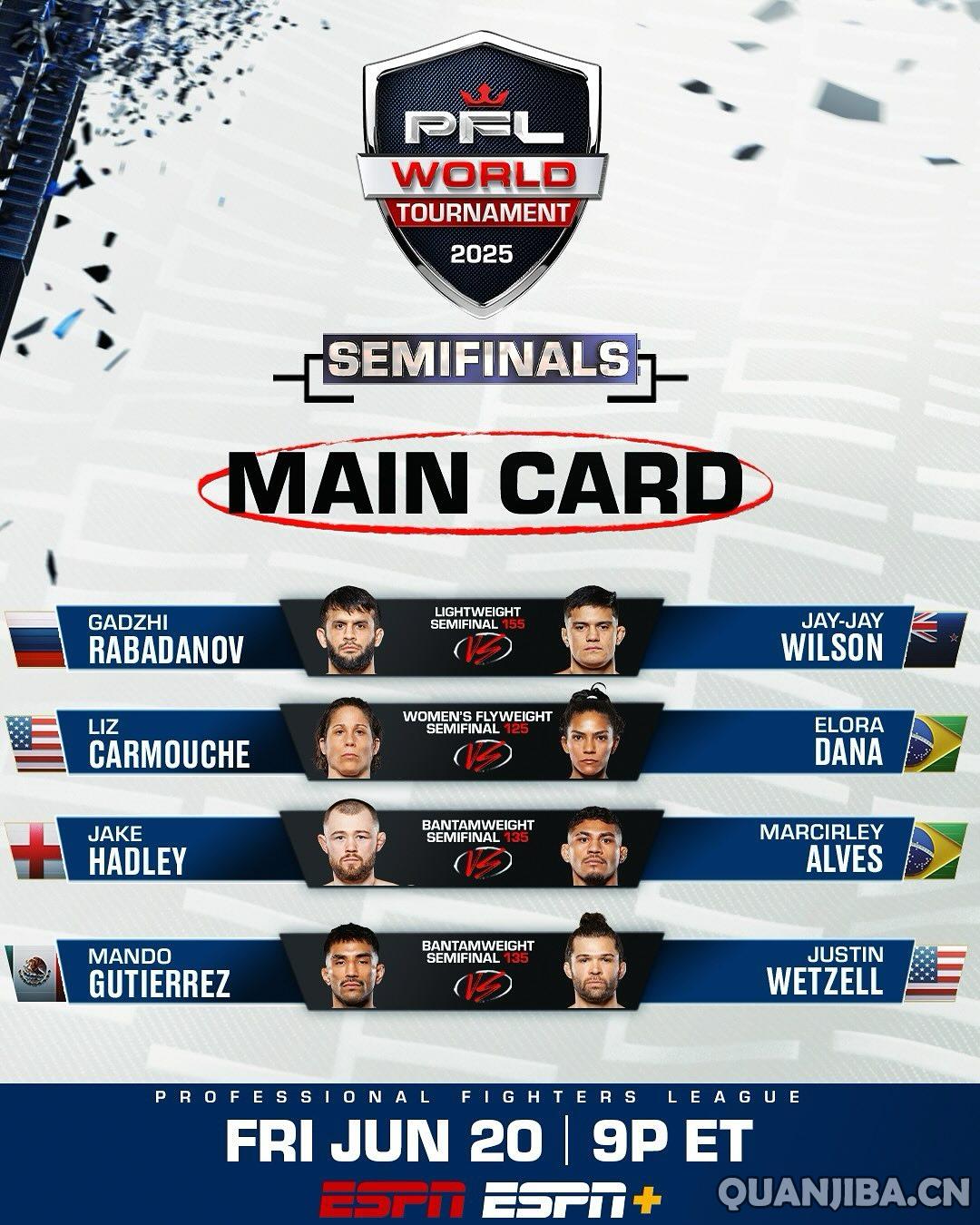 2025年PFL世界锦标赛的第六场较量,将于北京时间6月21日在美国威奇托盛大举行,比赛将包括轻量级、雏量级及女子蝇量级的激烈半决赛。