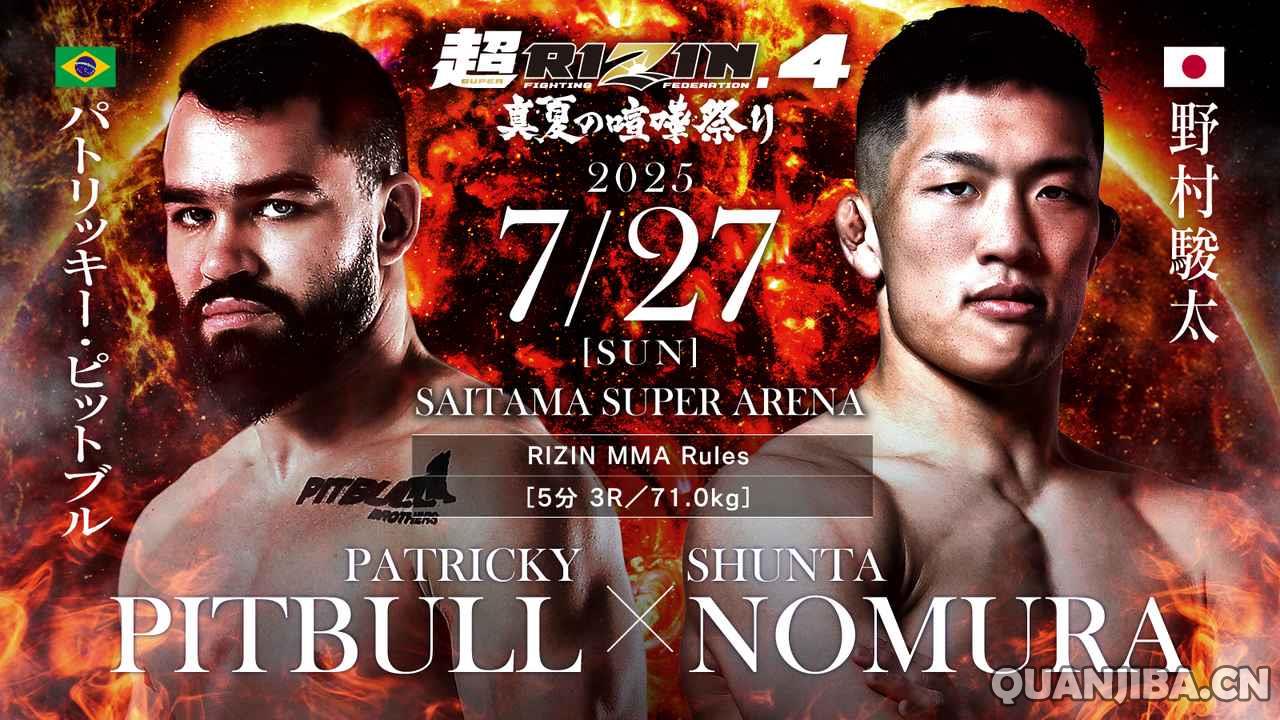 此外,一场备受瞩目的羽量级对决也将上演,前Bellator轻量级冠军帕特里奇·弗莱雷(Patricky Freire)(25胜14负,17 KO,1 SUB)将与本土选手野村骏太(Shunta Nomura)(9胜2负,4 KO,0 SUB)较量。