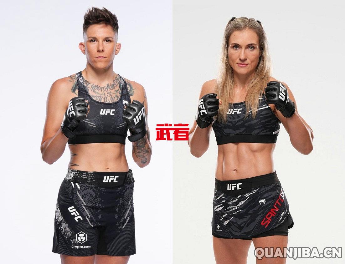亚娜·桑托斯(16-8, 7 KOs, 1 Sub, 1 N)目前35岁,身高173cm,臂展174cm。她于2009年开始职业MMA生涯,2017年获得Invicta FC雏量级冠军,并于2018年加入UFC,现战绩为(6-5)。经历了一些挫折之后,她在2024年成功以点数击败切尔西·钱德勒,并在今年5月再次战胜米莎·塔特,目前在UFC女子雏量级中排名第9。