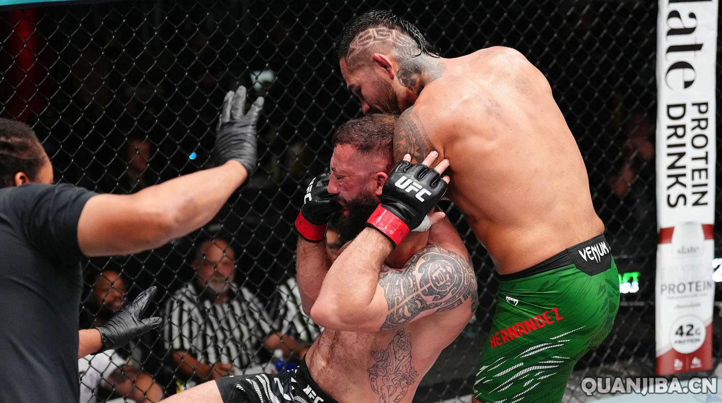 本次比赛的主头条战是中量级的一场焦点对决,排名第9位的格鲁吉亚战士罗曼·多利泽(15胜4负,8次KO,3次降服)与排名第10的本土选手安东尼·赫尔南德兹(15胜2负,3次KO,9次降服,1次无结果)展开了竞争。两位选手在技战术上的差异显而易见,开局双方其实都比较谨慎,互相试探,未能形成主攻。第二回合中,赫尔南德兹展现出更强的站立攻击及摔跤技术,多利泽几度被迫后退且频频被对手摔倒。赫尔南德兹并未选择在地面进行压制,而是让对手站起。进入第四回合时,赫尔南德兹抓住机会将多利泽拉入地面,接着实施连续的膝顶及背后裸绞,最终顺利获胜。这是赫尔南德兹自2021年以来的第八场胜利。