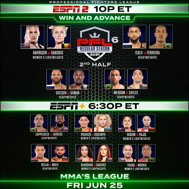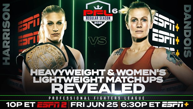 2021年赛季PFL第6期比赛将于6月25日在美国大西洋城举行,当天的头条主赛是2019年PFL女子轻量级冠军凯拉·哈里森(Kayla Harrison)对阵辛迪·丹多斯(Cindy Dandois)。联合主赛是2019年PFL重量级冠军阿里·伊萨耶夫(Ali Isayev)对阵雷南·费雷拉(Renan FerreiraMMA)。另外前UFC重量级冠军法布里西奥·温顿(Fabricio Werdum)也将出战对阵布兰登·塞尔斯(Brandon Sayles)。